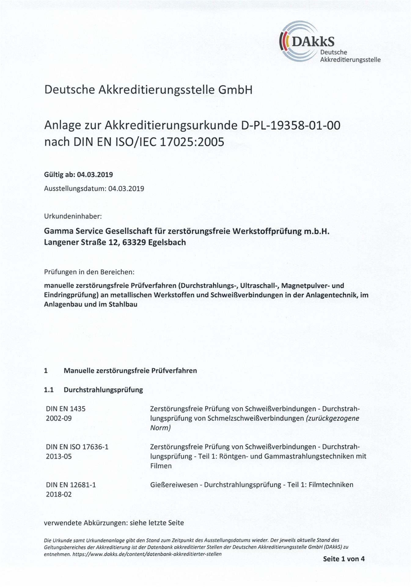 Gamma Service - Gesellschaft für zerstörungsfreie Werkstoffprüfungen mbH | Langener Str. 12 | D- 63329 Egelsbach | Tel: 06103 - 94040 |aktuell Januar 2026